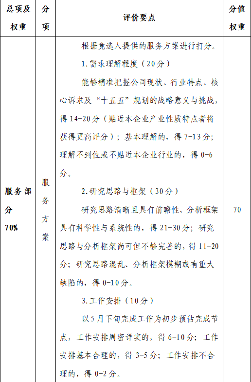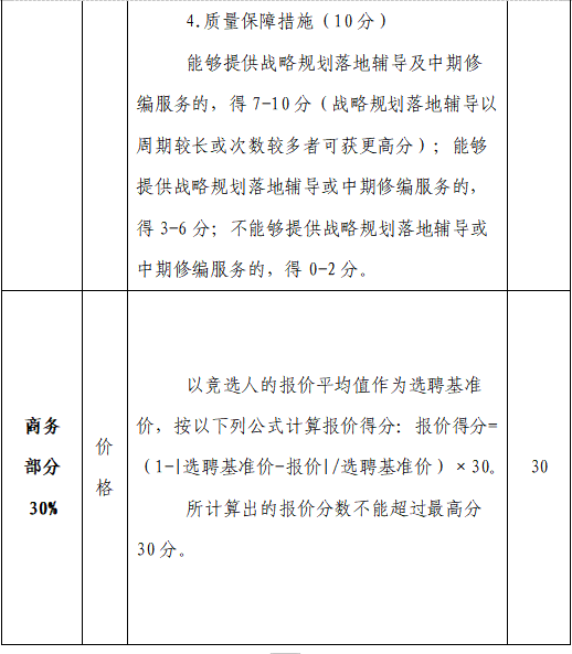評審方式采用綜合評分法,由評審人員根據(jù)評分辦法(詳見第八條)進行打分,并按照分?jǐn)?shù)由高到低順序確定中選單位,總分相同時按注冊資本金由高到低順序排名。